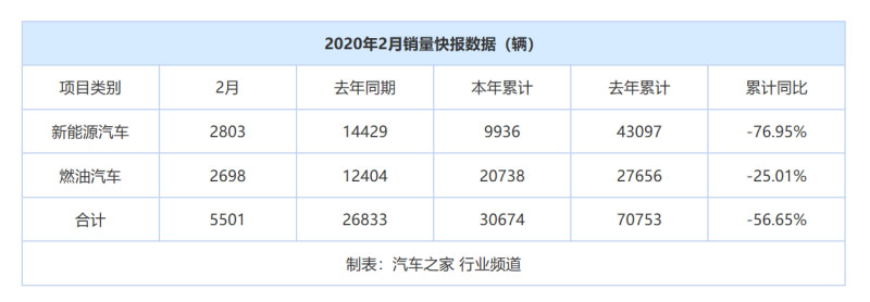 受到新型冠狀病毒感染肺炎疫情,以及春節(jié)假期影響,車市銷量整體出現(xiàn)下滑趨勢,比亞迪也未能幸免。3月7日,比亞迪發(fā)布銷量快報顯示,今年2月比亞迪共銷售新車5501輛,同比下降79.5%。今年前兩月累計(jì)銷量為30674輛,同比降低56.65%。