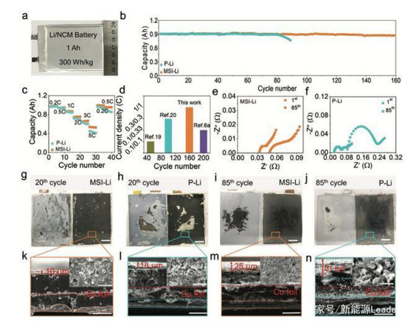 為了進(jìn)一步驗(yàn)證MSI保護(hù)層在實(shí)際中的效果,作者組裝了一個(gè)1Ah的軟包電池,該電池正極為NCM523(面容量密度3.38mAh/cm2),負(fù)極/正極冗余比為2.96,注液量為2.7g/Ah。作者采用1C倍率對(duì)電池進(jìn)行了循環(huán)測(cè)試,從下圖b中可以看到在循環(huán)80次后,采用普通金屬鋰負(fù)極的電池開始出現(xiàn)快速衰降,在第89次時(shí)容量就已經(jīng)衰降到了0.756Ah(容量保持率為84%),而采用表面處理后的電池則在經(jīng)過了160次循環(huán)后仍然能夠?yàn)槌?.872Ah(容量保持率96%),這表明MSI保護(hù)層能夠很好的穩(wěn)定金屬鋰負(fù)極的界面,提升電池的循環(huán)性能。