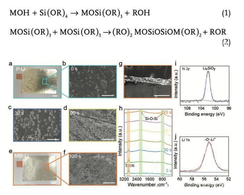 實(shí)驗(yàn)中作者采用四乙氧基硅烷(TEOS)對(duì)金屬鋰表面進(jìn)行了處理,四乙氧基硅烷與金屬鋰之間的反應(yīng)主要是通過與其表面的氫氧官能團(tuán)發(fā)生反應(yīng)實(shí)現(xiàn)(如下式所示)。從下圖可以看到,在處理之前金屬鋰表面呈現(xiàn)出金屬光澤,SEM圖片也顯示此時(shí)金屬Li表面非常粗糙,表面還有大量的點(diǎn),而經(jīng)過處理后金屬Li的表面形成了一層非常致密的表面層。