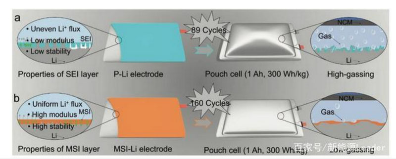 產(chǎn)氣也是軟包鋰離子電池常見的問題,產(chǎn)氣后會(huì)導(dǎo)致電池鼓脹,導(dǎo)致電芯內(nèi)部正負(fù)極極片之間的距離增加,導(dǎo)致電池阻抗增加,進(jìn)而影響電池的循環(huán)壽命。因此作者對(duì)MSI保護(hù)層對(duì)電池產(chǎn)氣的影響進(jìn)行了研究,從下圖可以看到在1C倍率下循環(huán)40次后電池就開始出現(xiàn)明顯的產(chǎn)氣,但是MSI保護(hù)的金屬鋰電池產(chǎn)氣要明顯少于普通金屬鋰二次電池,存儲(chǔ)后MSI保護(hù)的金屬鋰電池產(chǎn)氣同樣少于普通金屬鋰二次電池。這主要是因?yàn)镸SI保護(hù)層能夠阻止金屬鋰與電解液之間的接觸,從而減少副反應(yīng)的發(fā)生,同時(shí)MSI保護(hù)層良好的機(jī)械強(qiáng)度也能夠承受金屬鋰枝晶和體積膨脹的破壞,也起到了保護(hù)金屬鋰負(fù)極的作用。
