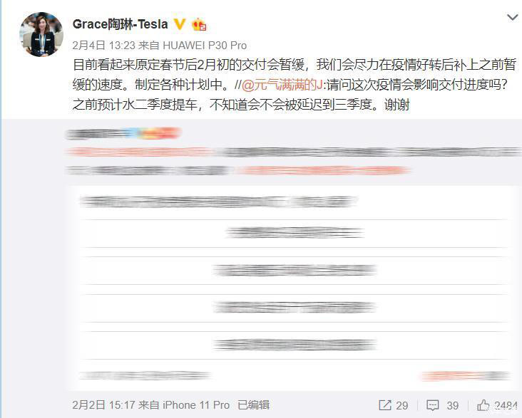 2月4日,有用戶在微博上提問,特斯拉是否會因疫情影響延遲第一、二季度的車輛交付工作,對此特斯拉公司全球副總裁陶琳在微博上回復(fù),表示原定于春節(jié)后2月的交付工作會因疫情暫緩,目前正在制定相關(guān)計劃中。