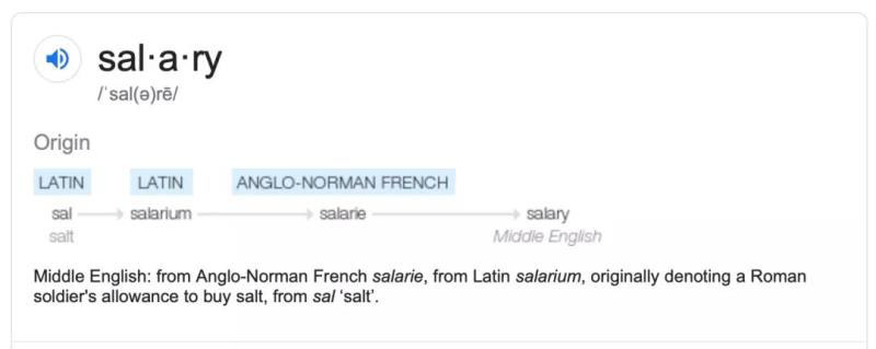 英語(yǔ)中的“to be worth one’s salt”一詞的意思是某人有能力,對(duì)得起他們掙的錢。據(jù)說(shuō)這句話起源于古羅馬,士兵有時(shí)會(huì)得到鹽作為報(bào)酬或購(gòu)買鹽的津貼。其實(shí)英語(yǔ)“Salary” (工資)這一詞來(lái)源于拉丁語(yǔ) “salarium”,最初就是指士兵買鹽的津貼。