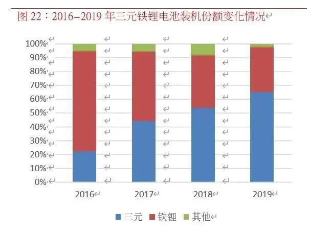 三元電池對鐵鋰電池份額的擠壓始于 2016 年,在乘用車領域,三元迅速取代鐵鋰,裝機份額逐漸提升。在專用車領域,三元的裝機量也有較大增長,而客車領域由于政策的原因,未放開三元電池配套。2019 年全年,我國動力電池裝機量達到62GWh,乘用車裝機量 42GWh,客車裝機量14.55GWh,專用車裝機量5.4GWh,乘用車已經(jīng)成為拉動電池裝機的主要領域。因此三元的份額在裝機總量中快速提升,達到 40GWh,裝機份額65%,較 18 年增加10GWh;而鐵鋰電池的裝機量僅 20GWh,裝機量連續(xù)三年出現(xiàn)增長瓶頸,裝機份額下降至32%。
