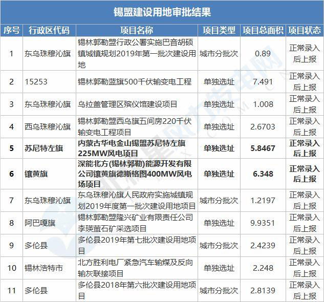 分別為:內(nèi)蒙古華電金山錫盟蘇尼特左旗225MW風(fēng)電項目、深能北方(錫林郭勒)能源開發(fā)有限公司鑲黃旗德斯格圖400MW風(fēng)電場項目、斯能阿巴嘎旗3號風(fēng)電場一期150MW風(fēng)電項目、華潤電力新能源投資有限公司太仆寺旗300MW風(fēng)電項目、內(nèi)蒙古華電蘇尼特左旗滿都拉圖一期100MW風(fēng)電項目、內(nèi)蒙古京能蘇尼特風(fēng)力發(fā)電有限公司30萬千瓦風(fēng)電項目;