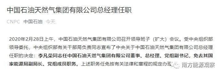 繼2020年1月17日中石油、中石化換帥之后,中石油今日再次迎來(lái)新的人事任命。據(jù)中石油集團(tuán)官方微信公眾號(hào)信息,國(guó)家能源局副局長(zhǎng)李凡榮調(diào)任中國(guó)石油天然氣集團(tuán)有限公司董事、總經(jīng)理、黨組副書(shū)記。