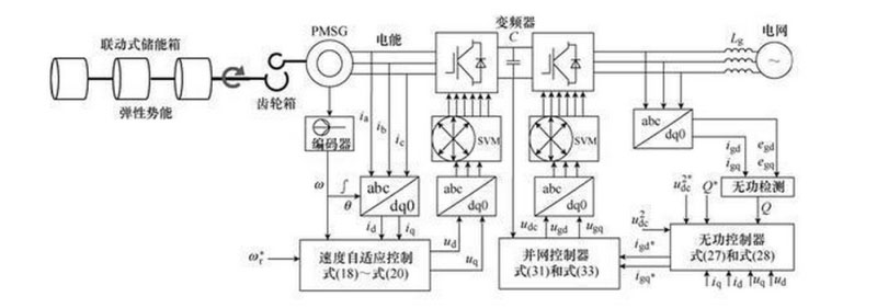 基于傳統(tǒng)儲能箱組“手拉手”機械結(jié)構(gòu),通過增加單向超越離合器使儲能箱之間實現(xiàn)了柔性聯(lián)動,且具有防反轉(zhuǎn)自鎖功能。建立了儲能箱額定功率、儲能容量配置數(shù)學(xué)模型,并根據(jù)其特殊運行特性曲線,提出一種適用于機組發(fā)電過程的永磁同步發(fā)電機轉(zhuǎn)速自適應(yīng)控制算法,同時提出一種網(wǎng)側(cè)變流器反推魯棒控制算法。
