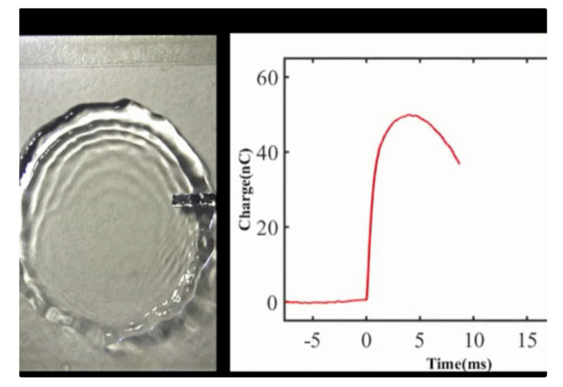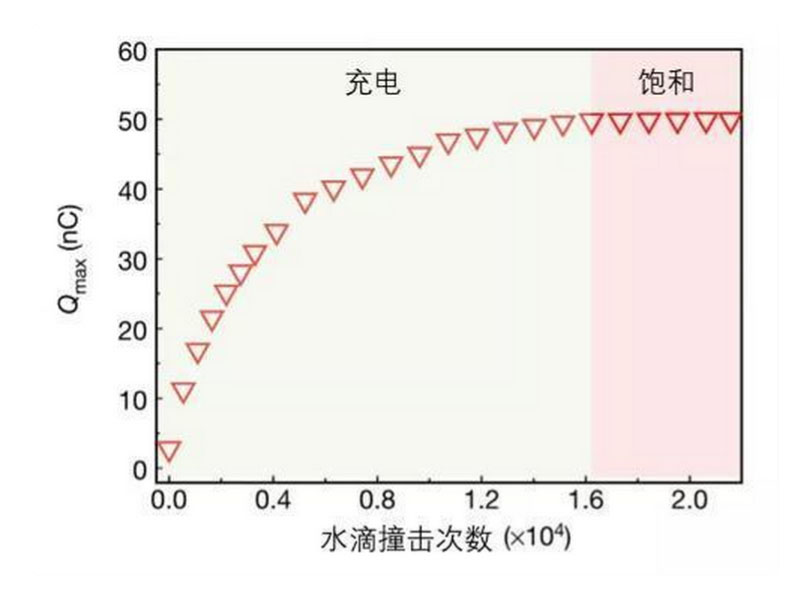 他們發(fā)現(xiàn),經(jīng)過(guò)自來(lái)水液滴持續(xù)的撞擊,表面效應(yīng)就會(huì)變成體效應(yīng):聚四氟乙烯的表面將累積起很高的電荷密度,這個(gè)電荷密度會(huì)在 16000 次撞擊之后達(dá)到最高值。也就是說(shuō),他們把一種日常生活中常見的材料,變成了類似電容一樣的儲(chǔ)存大量電荷的容器。