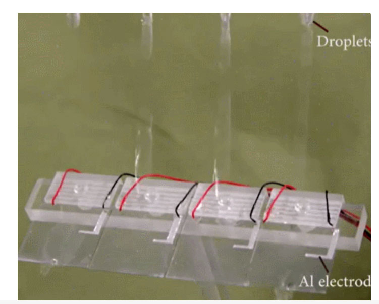 在聚四氟乙烯和氧化銦錫電極之外,他們還安裝了一個(gè)鋁電極。這樣一來(lái),這個(gè)發(fā)電機(jī)就像半導(dǎo)體中的三極管一樣,擁有了三個(gè)電極。這第三個(gè)電極成為了提高水滴發(fā)電機(jī)功率的關(guān)鍵。