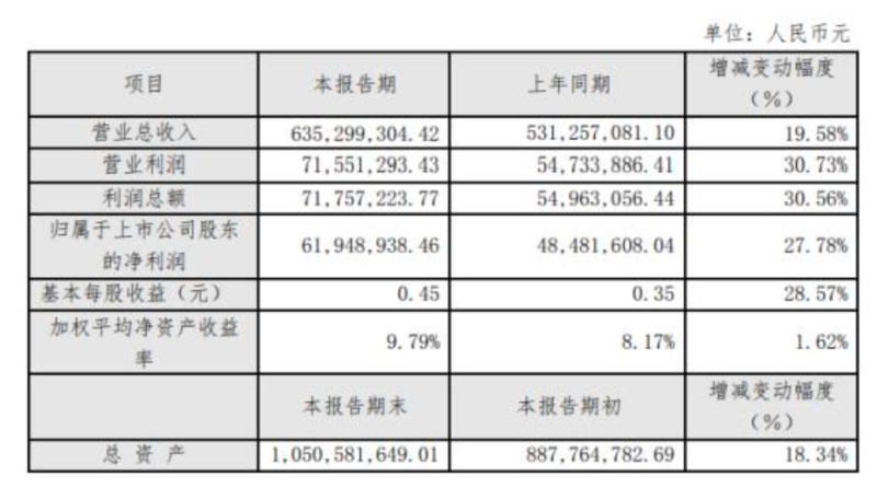 據(jù)了解,報告期內,實現(xiàn)營業(yè)收入635,299,304.42元,較上年同期增長19.58%;實現(xiàn)營業(yè)利潤71,551,293.43元,較上年同期增長30.73%;實現(xiàn)利潤總額71,757,223.77元,較上年同期增長30.56%;實現(xiàn)歸屬于上市公司股東的凈利潤61,948,938.46元,較上年同期增長27.78%。