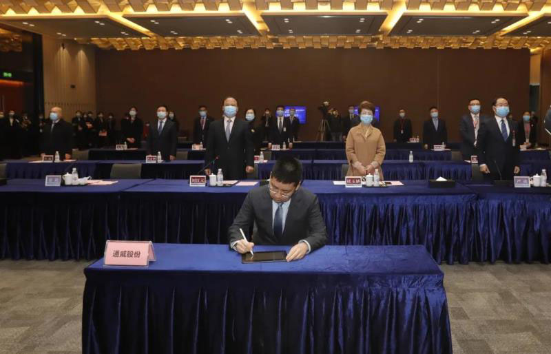 2月28日,通威股份與樂山市政府、五通橋區(qū)政府以“云簽約”方式正式簽訂《高純晶硅投資協(xié)議書》,宣布永祥樂山高純晶硅二期項(xiàng)目正式落戶樂山市五通橋區(qū)。樂山市委書記彭琳,市委副書記、市長張彤,市委副書記曾洪揚(yáng),市政府副市長廖克全,五通橋區(qū)委書記張國清,區(qū)委副書記、區(qū)長李良在樂山出席并見證項(xiàng)目簽約,通威集團(tuán)董事局劉漢元主席,通威集團(tuán)禚玉嬌總裁,通威股份董事長謝毅,通威股份副董事長嚴(yán)虎,通威股份董事、永祥股份董事長兼總經(jīng)理段雍,通威股份總裁郭異忠,永祥股份財(cái)務(wù)總監(jiān)袁仕華,永祥股份副總經(jīng)理兼永祥新能源總經(jīng)理李斌在成都通威國際中心出席簽約儀式。