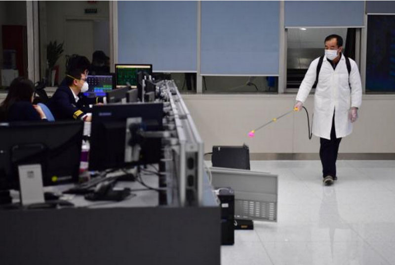 2月6日,后勤人員在調(diào)度大廳內(nèi)消毒。