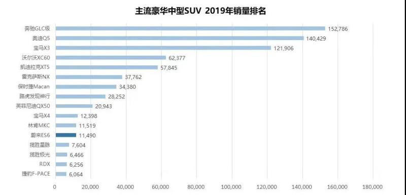 其中,ES6在2019年累計(jì)銷售11490輛,在主流豪華中型SUV銷量排名中,位列第12位。其競(jìng)爭(zhēng)對(duì)手均為燃油車。