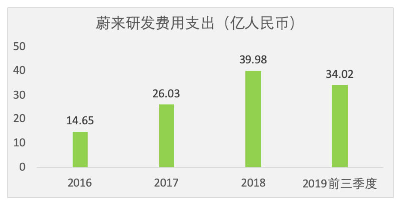 2018年,蔚來(lái)整體研發(fā)投入為39.979億元人民幣,比2017年增長(zhǎng)53.6%。2019年前三季度研發(fā)費(fèi)用支出34.02億元,在艱難的第三季度,蔚來(lái)在研發(fā)方面的投入依然達(dá)到了10.232億元。