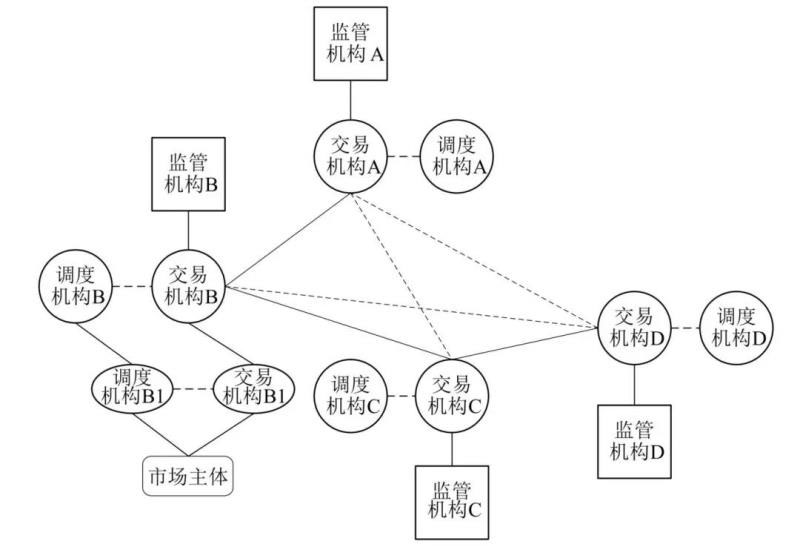 由于國家差異,不同國家交易中心之間可能存在網(wǎng)絡連接(實線表示),也可能沒有建立網(wǎng)絡連接(虛線表示)。在歐洲,跨國電力交易由各國的交易中心負責申報和結算,輪流出清,調(diào)度機構負責跨國聯(lián)絡線的調(diào)度運行。國家B是兩級(國家級和省級)市場的示例,類似中國的省間和省內(nèi)市場,國家級交易中心負責省間和跨國電力交易,省級交易中心負責省內(nèi)電力交易。