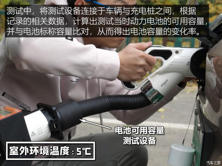 在動力電池可用容量測試中,使用了專業(yè)的動力電池容量測試設(shè)備,測試時將該設(shè)備連接于充電樁與被測車輛之間,通過監(jiān)測到的充電電壓、電流和充入電量等動態(tài)數(shù)據(jù),以及動力電池SOC的變化率,計算出車輛測試時動力電池的可用容量,并與車企標(biāo)稱的容量進(jìn)行比對,從而得出動力電池當(dāng)時的可用容量變化率。
