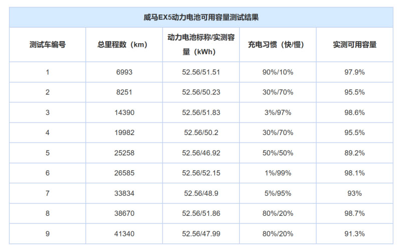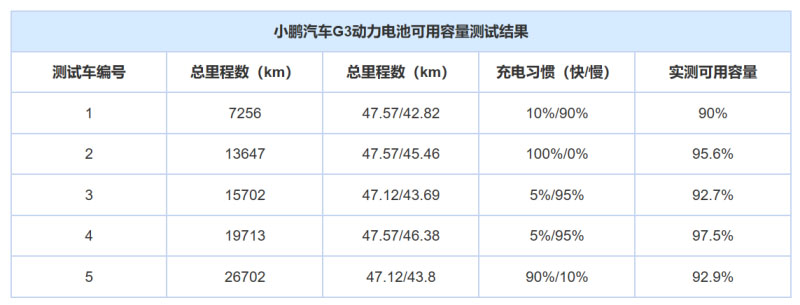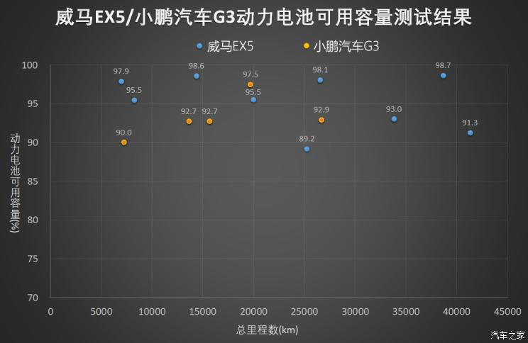 測試結(jié)果顯示,9輛威馬EX5車型的動力電池可用容量平均減少4.68%,5輛小鵬G3車型平均減少6.26%。雖然從平均數(shù)值上看,威馬EX5的數(shù)據(jù)較好,但其測得的可用容量減少量在1.9%-10.8%;而小鵬G3測得的可用容量減少量在2.5%-10%。所有被測車輛的動力電池可用容量變化,均在正常范圍之內(nèi)。