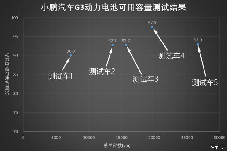 5輛小鵬G3均為2018款車型,其中2輛是NECD續(xù)航里程為351km的車型,官方標(biāo)稱的動力電池容量為47.1kWh;3輛是NEDC續(xù)航里程為365km的車型,官方標(biāo)稱的動力電池容量為47.6kWh。5輛測試車的行駛里程也有著不小的差距,從剛剛超過7000km到超過26000km不等。