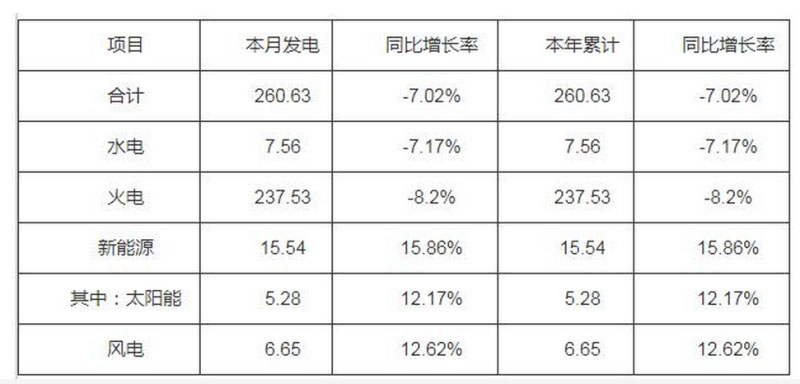 (一)發(fā)電量情況。1月份當月,全省發(fā)電量260.63億千瓦時,同比減少7.02%。其中水電7.56億千瓦時,同比減少7.17%;火電237.53億千瓦時,同比減少8.2%;新能源15.54億千瓦時,同比增長15.86%。