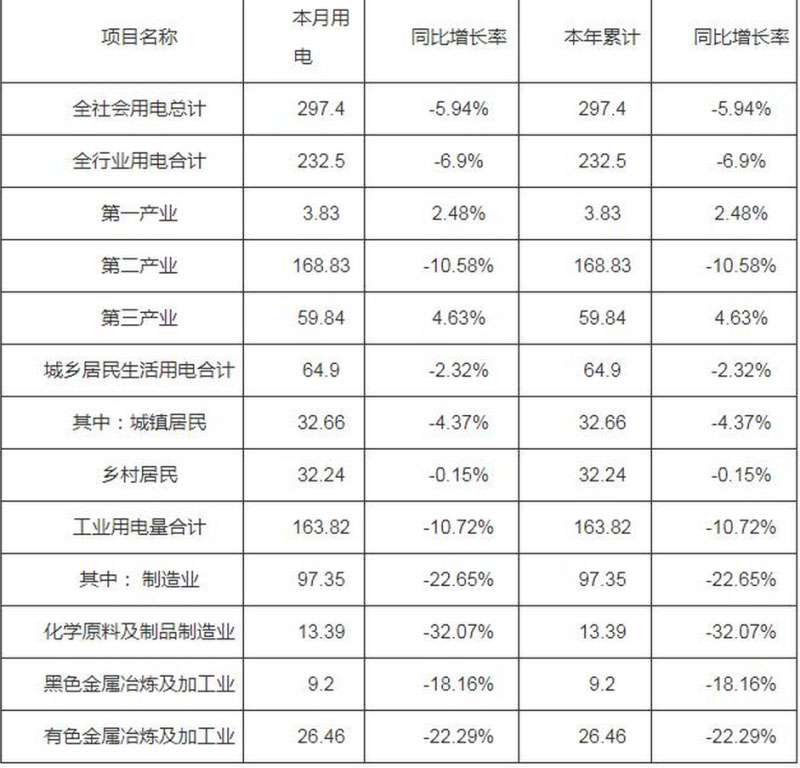 (一)全社會用電量情況。全省全社會用電量297.4億千瓦時,同比減少5.94%;累計用電量297.4億千瓦時,同比減少5.94%。