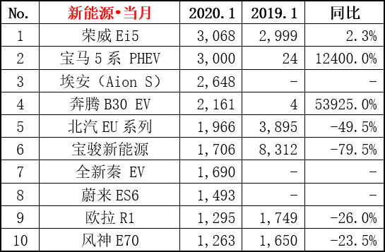 猛烈的市場沖擊下,1月新能源汽車車型銷量榜單亦呈現(xiàn)“千奇百怪”狀態(tài),銷量榜單TOP 10車型可謂出現(xiàn)了整容式變化,首先是榜單老熟人比亞迪元、e5、吉利帝豪EV、奇瑞eQ1等車型集體“失蹤”,而留在榜單的老面孔榮威Ei5、北汽EU系列、歐拉R1等車型表現(xiàn)各異,如上汽榮威Ei5以3068輛位列第一,北汽EU系列則退居第5。