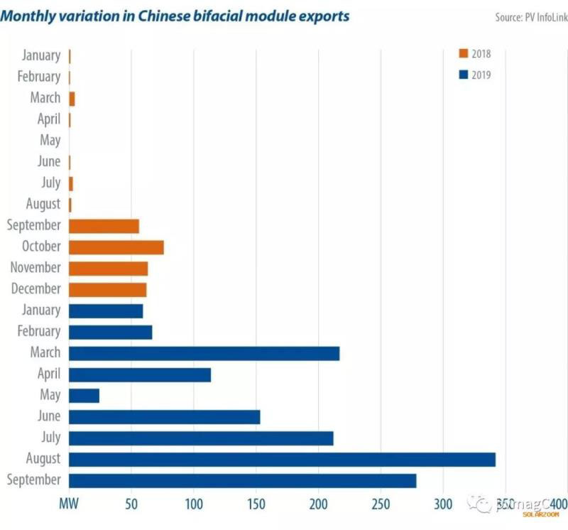 自2018年末至進(jìn)入2019年以來(lái),雙面組件的出口量出現(xiàn)明顯增長(zhǎng)趨勢(shì)。歐洲、日本、美國(guó)等對(duì)高效產(chǎn)品有需求的市場(chǎng),中國(guó)雙面光伏組件出口呈現(xiàn)逐年增長(zhǎng)的趨勢(shì)。