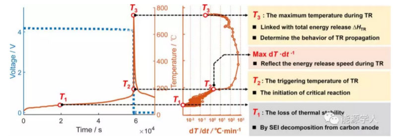 熱分析數(shù)據(jù)庫的建立促進了對于電池熱失控定義的共同認識?;谠摂?shù)據(jù)庫,歐陽明高院士提出了商品化鋰離子電池熱失控過程中的三個特征溫度—T1、T2、 T3。其中,T1代表的是電池反常產熱的起始溫度,它能夠反映電池整體的安全性,通常是由負極材料的氧化還原反應所造成的。T2是區(qū)分漸變式升溫與劇烈升溫的臨界點,也被視為是電池熱失控的引發(fā)溫度。具有較高T2溫度的鋰離子電池通常更容易通過針刺等安全測試。T3是電池熱失控過程中能夠達到的最高溫度,常常與電池總體產熱呈正相關并決定著熱失控的程度。這三個熱失控過程中的特征溫度對于定義熱失所處階段和評估其影響提供了參考。