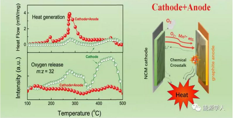 通常條件下,人們認為鋰離子電池的熱失控是在濫用條件下由內短路引發(fā)的,或者說至少熱失控過程會伴隨著隔膜收縮等問題引發(fā)的電池內短路。然而,歐陽明高院士最近的一篇Joule文章首次報道了電池在不發(fā)生內短路的情況下仍然會發(fā)生嚴重的放熱。這是由于正負極化學交叉造成的:三元正極充電過程中發(fā)生相變釋氧,高氧化性的氣體與高還原性的鋰化負極發(fā)生反應導致電池劇烈放熱從而發(fā)生熱失控。