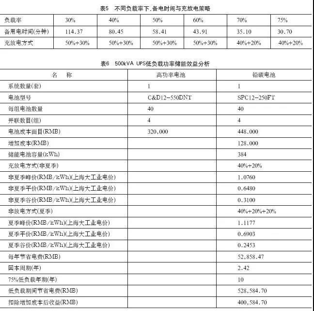 4、500kVAUPS配置SPC12-250FT×40只×4組,在不同負(fù)載率備電時(shí)間及充放電策略見表5。