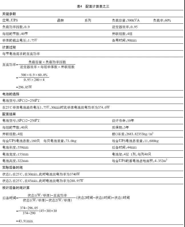 3、以500kVA的UPS為例,在60%負(fù)載條件下,配置160只12V/200Ah鉛碳電池,后備時(shí)間為43.91min,配置計(jì)算表見表4。