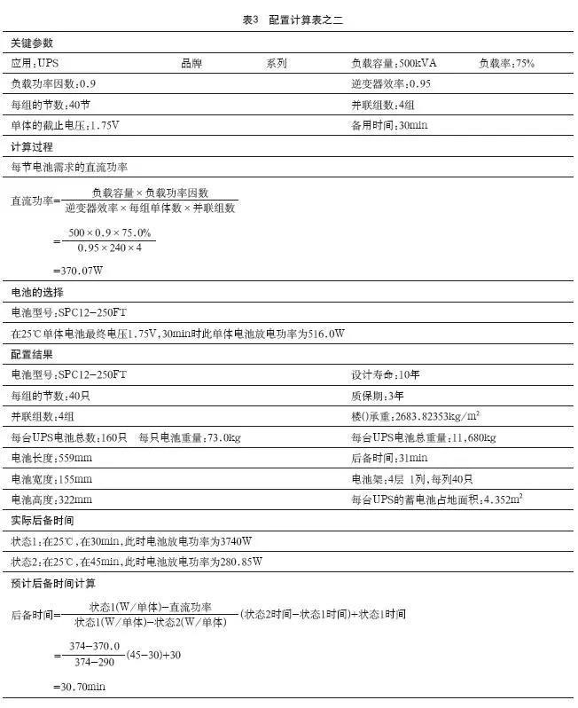 2、以500kVA的UPS為例,在75%負(fù)載條件下,配置160只12V/200Ah鉛碳電池,后備時(shí)間為30.7min,配置計(jì)算表見表3。