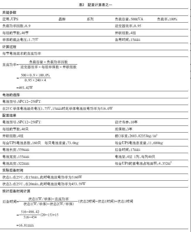 1、以500kVA的UPS為例,在滿負(fù)載條件下,配置160只12V/200Ah鉛碳電池,后備時(shí)間為16.8min,配置計(jì)算表見表2。