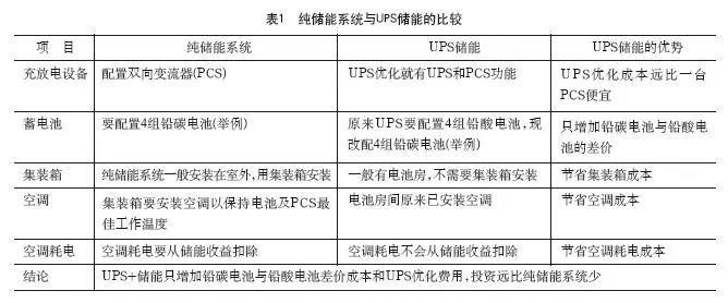 純儲(chǔ)能系統(tǒng)與UPS儲(chǔ)能的比較見表1。