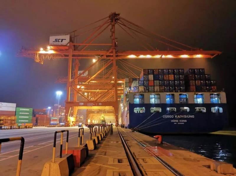 此次接電成功的“中遠(yuǎn)高雄”號(hào)貨輪是我國(guó)自行研制生產(chǎn)的第一批萬(wàn)箱船,也是亞洲最大、世界第三大新一代萬(wàn)箱船,船長(zhǎng)348.5米,寬45.6米,高65.7米,總重11.6萬(wàn)噸,裝載量達(dá)11.2萬(wàn)噸。