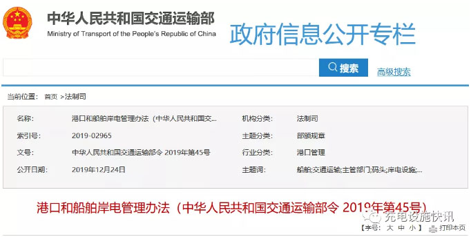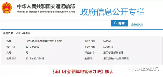 《港口和船舶岸電管理辦法》已于2019年12月4日經(jīng)第29次部務會議通過,現(xiàn)予公布,自2020年2月1日起施行。