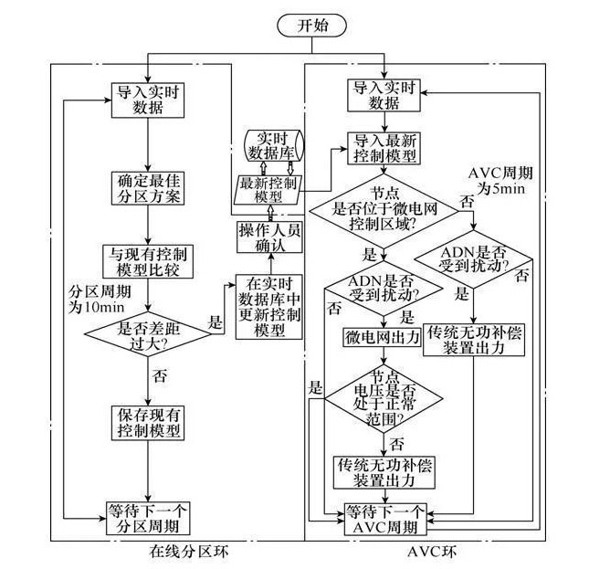 為了提升系統(tǒng)電壓穩(wěn)定性,本文提出了一種微電網(wǎng)參與的ADN電壓分區(qū)與自動(dòng)控制策略。首先基于電壓靈敏度指標(biāo)對(duì)ADN節(jié)點(diǎn)進(jìn)行聚類(lèi)分區(qū),分區(qū)后,微電網(wǎng)應(yīng)能滿(mǎn)足所屬區(qū)域的無(wú)功補(bǔ)償需求,且不影響其他區(qū)的節(jié)點(diǎn)電壓水平,實(shí)現(xiàn)較好的區(qū)域無(wú)功補(bǔ)償。當(dāng)配電網(wǎng)內(nèi)無(wú)功潮流波動(dòng)引起網(wǎng)絡(luò)節(jié)點(diǎn)電壓變化時(shí),自動(dòng)電壓控制系統(tǒng)(Automatic Voltage Control, AVC)通過(guò)監(jiān)視電壓的變化,控制微電網(wǎng)進(jìn)行無(wú)功出力以平抑電壓波動(dòng)。