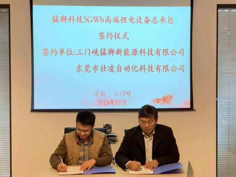 2019年12月17日下午,三門峽猛獅新能源科技有限公司和東莞市壯凌自動(dòng)化科技有限公司舉行簽約儀式,雙方就“三門峽猛獅新能源年產(chǎn)5GWh高端鋰離子電池生產(chǎn)項(xiàng)目”設(shè)備總承包簽訂設(shè)備采購(gòu)合同,合同總金額約5億元人民幣。