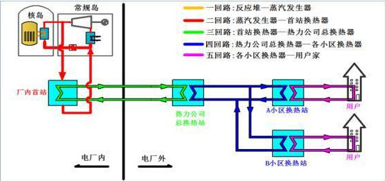 核能供熱,簡而言之,就是從核電機組中抽取高溫高壓蒸汽作為熱源,采用多級換熱技術(shù),借助換熱站實現(xiàn)水汽換熱、水水換熱,通過一共五個回路的運行,最后通過市政供熱管網(wǎng)將熱量傳遞給用戶。