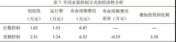 對(duì)兩種運(yùn)行方案的二次泵初投資及生命周期運(yùn)行費(fèi)進(jìn)行計(jì)算,見表7。因?yàn)槌跬顿Y的增加,變頻的壽命周期費(fèi)用僅略小,對(duì)數(shù)據(jù)中心而言,從經(jīng)濟(jì)性角度看,定壓變頻控制的優(yōu)勢(shì)并沒有那么明顯。