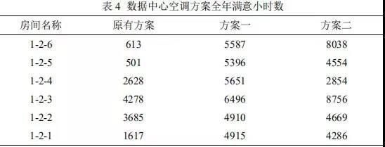 對(duì)上述空調(diào)系統(tǒng)方案進(jìn)行模擬計(jì)算,可以計(jì)算得到各系統(tǒng)全年滿意(系統(tǒng)可達(dá)到設(shè)計(jì)要求)小時(shí)數(shù)如表4所示,對(duì)比發(fā)現(xiàn)各房間全年滿意小時(shí)數(shù)有明顯增加,有的甚至增加了一倍。