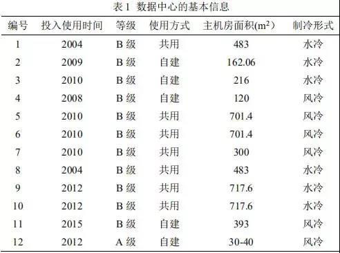 本次調(diào)研對(duì)象為北京市12處數(shù)據(jù)中心,其基本信息見表1。本次調(diào)研對(duì)象從投入使用時(shí)間、規(guī)模以及制冷形式來看,基本涵蓋了北京市所有數(shù)據(jù)中心的類型,選取的數(shù)據(jù)中心樣本具有一定的代表性。調(diào)研內(nèi)容包括數(shù)據(jù)中心基本信息、能源評(píng)價(jià)信息、能耗指標(biāo)信息、能源管理系統(tǒng)信息。