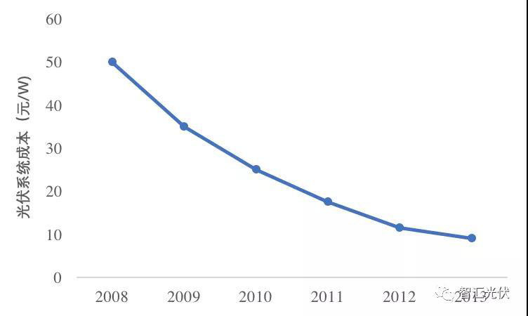 電價下降最重要的原因,是光伏系統(tǒng)成本的下降。其中,主要是光伏組件價格的下降。系統(tǒng)成本從當年的80元/W,一路下降到當年的3.5元/W。