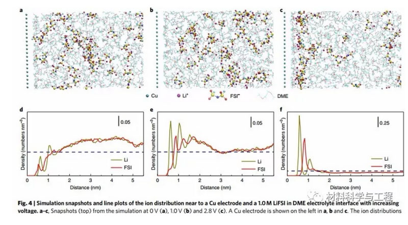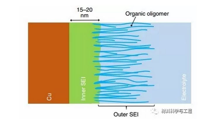 特別地,帶負(fù)電的電極表面從內(nèi)層排斥陰離子,并產(chǎn)生薄而致密的、無機(jī)的SEI內(nèi)層。正是這個(gè)致密層負(fù)責(zé)傳導(dǎo)Li +而絕緣電子。在SEI內(nèi)層形成后,會(huì)出現(xiàn)電解質(zhì)可滲透、富含有機(jī)物的外層。研究發(fā)現(xiàn)SEI內(nèi)層的主要成分為氧化鋰,否定了相界面上含有氟化鋰的傳統(tǒng)觀點(diǎn)。這些實(shí)時(shí)的納米級(jí)觀測(cè)將有助于為將來的電池設(shè)計(jì)更好的界面相。(來源:材料科學(xué)與工程公眾號(hào))