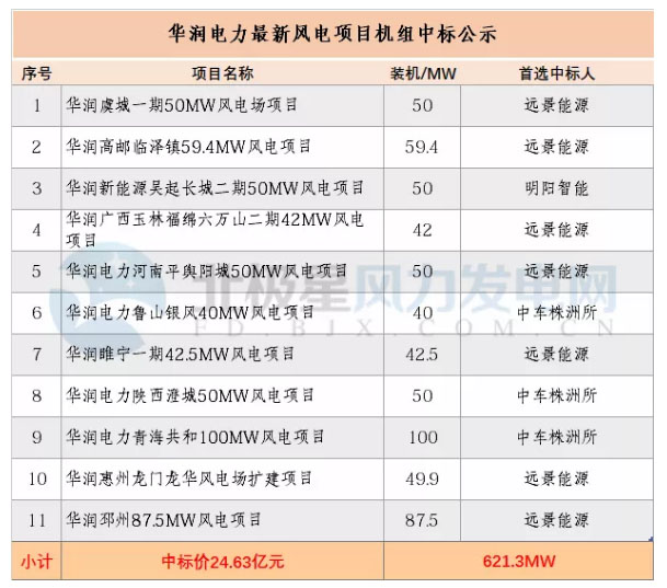 中國儲能網(wǎng)訊: 10月29日,華潤電力發(fā)布11個風(fēng)電項目機組貨物及服務(wù)中標(biāo)公示,其中遠(yuǎn)景能源(381.3MW),中標(biāo)7個風(fēng)電項目;中車株洲所(190MW),中標(biāo)3個風(fēng)電項目;明陽智能(50MW),中標(biāo)1個風(fēng)電項目。具體見下表: