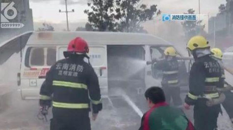 從市民拍攝的視頻可以看到,一輛面包車冒著濃煙,車內(nèi)還能看見明火,工作人員正在用水槍進(jìn)行滅火。