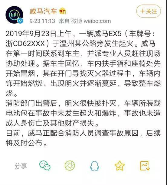 今日上午11點,威馬汽車官方微博發(fā)布信息稱,2019年9月23日上午,一輛威馬EX5(車牌號:浙CD62XXX)于溫州某公路旁發(fā)生起火。這是繼去年8月以來,威馬EX5發(fā)生的第二次起火事故。