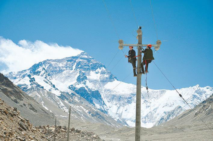 2014年4月12日16時(shí),隨著一條10千伏供電線(xiàn)路合閘送電,海拔5200米的珠穆朗瑪峰大本營(yíng)正式通電。國(guó)家電網(wǎng)通過(guò)大電網(wǎng)延伸方式,點(diǎn)亮了世界海拔最高的地方。