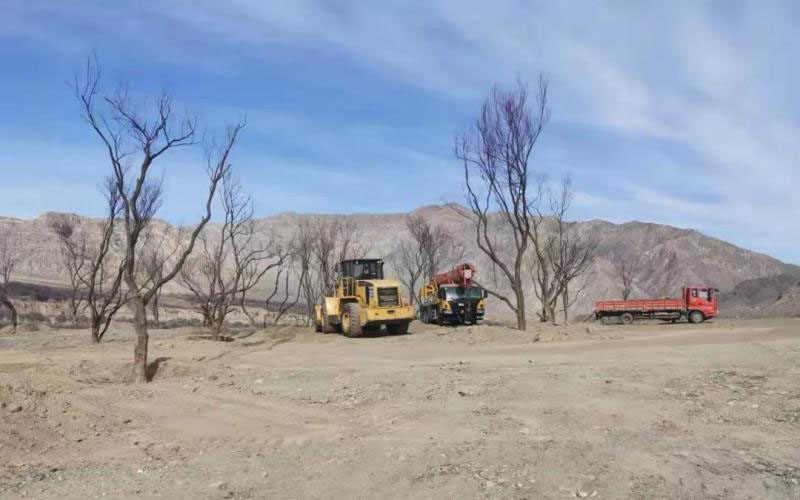 12月16日,工人駕駛卡車、吊車、挖掘機正在移植檉柳。受訪者供圖