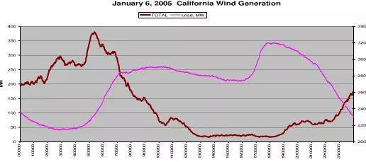 而且,夜晚用電負(fù)荷處于低谷時(shí)段風(fēng)電發(fā)電出力往往較大,即使常規(guī)電源降出力,當(dāng)風(fēng)電規(guī)模達(dá)到一定程度(大于低谷用電負(fù)荷),也難免出現(xiàn)限電棄風(fēng)。下圖為風(fēng)電出力曲線和負(fù)荷需求曲線對(duì)照。