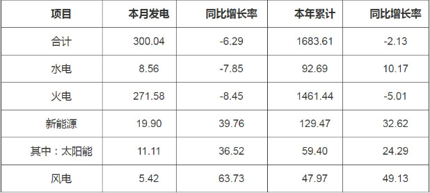 (一)發(fā)電量情況。7月份當月,全省發(fā)電量300.04億千瓦時,同比減少6.29%。其中水電8.56億千瓦時,同比減少7.85%;火電271.58億千瓦時,同比減少8.45%;新能源19.89億千瓦時,同比增長39.76%。