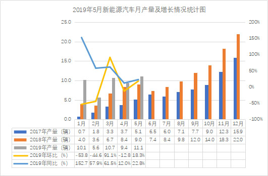 真鋰研究數(shù)據(jù)顯示2019年5月新能源汽車總產(chǎn)量11.1萬輛,比上年同期增長22.8%。累計方面,1-5月新能源汽車總產(chǎn)量47萬輛,比上年同期(31.7萬輛)增長48.7%。